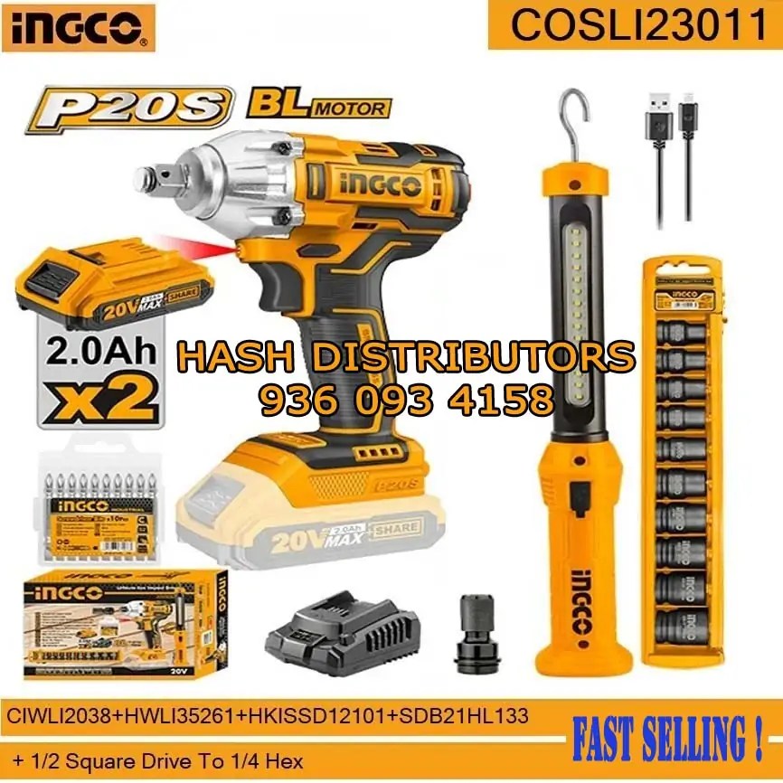 Ingco COSLI23011 Combo kit with brushless impact wrench, comes along with battery and charger along with LED Light.